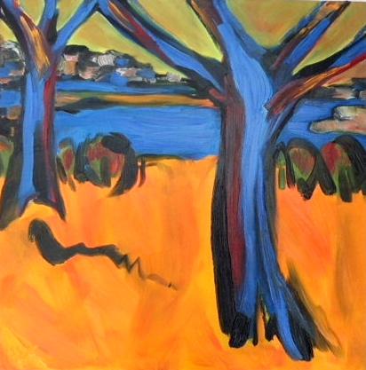 blaue bäume am wasser öl/lwd 50x40cm arbres bleus au lac huile/toile