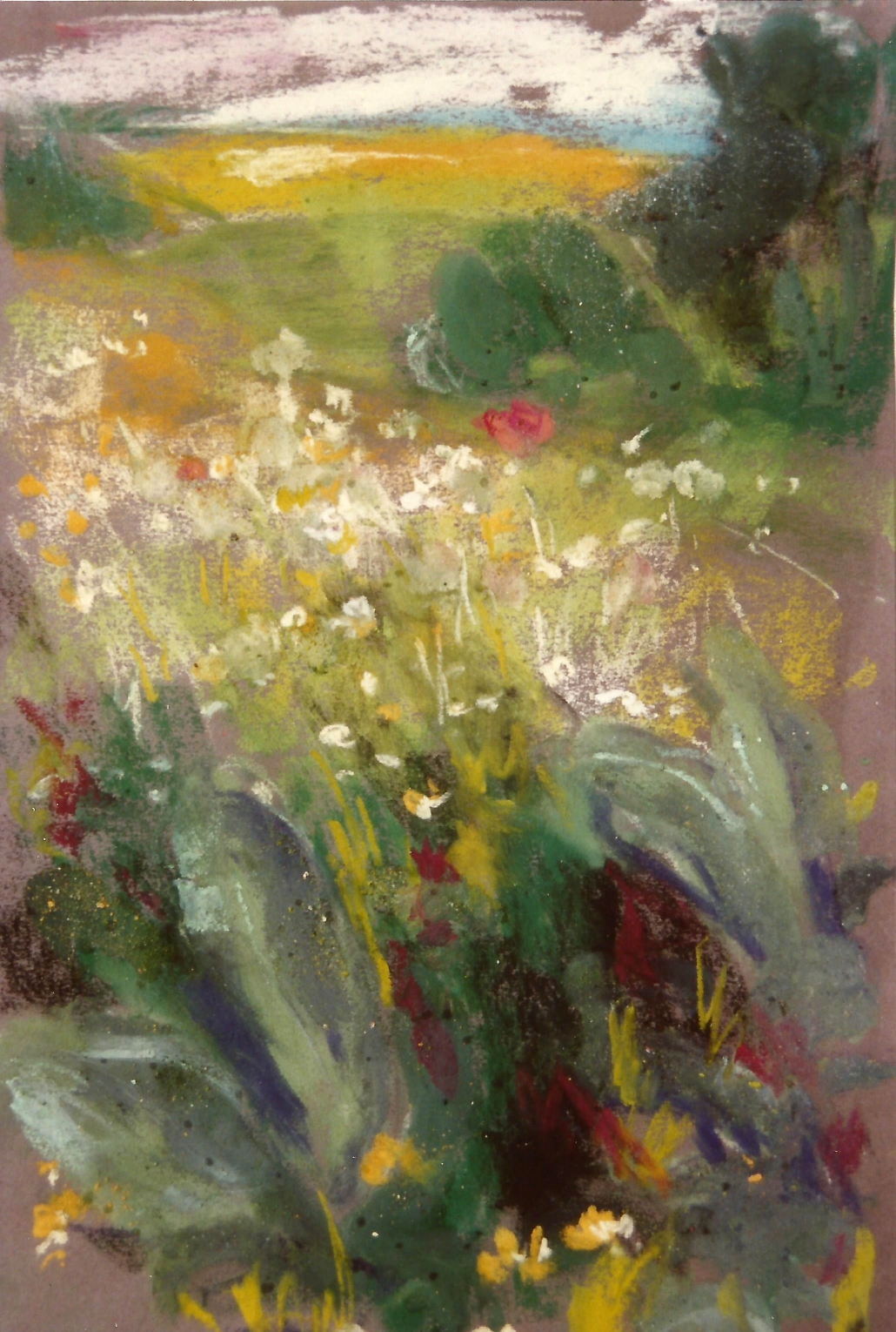 landschaft mit roter blume, pastell, 40x30cm, paysage avec fleur rouge