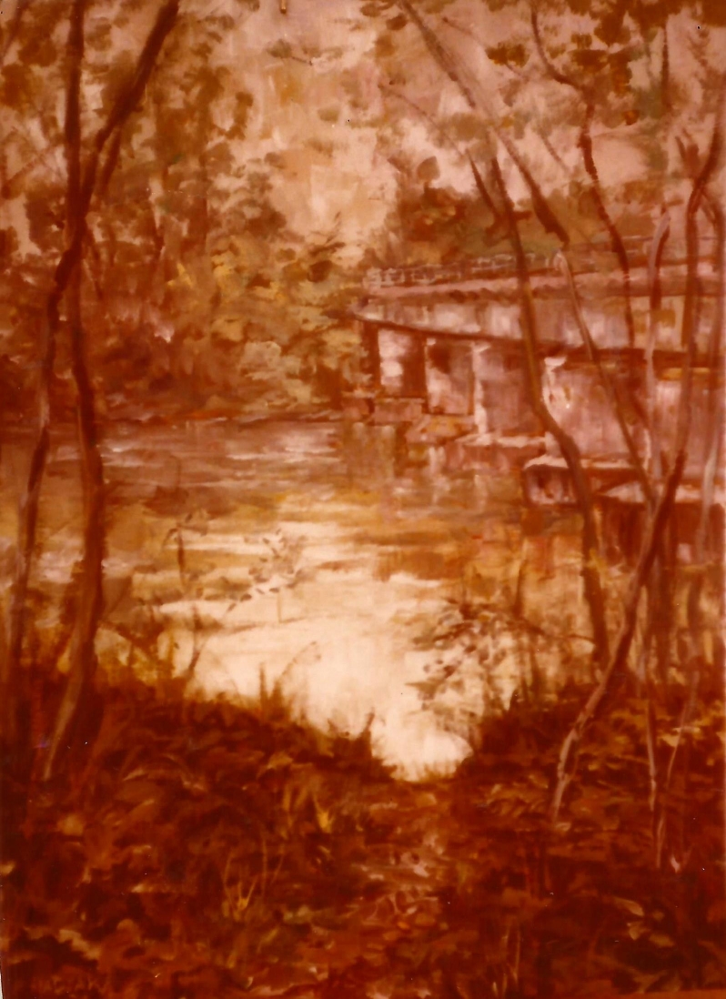 lechbrücke bei lechmühlen 1978, acryl lwd, 80x60cm, le pont du lech vers lehmühlen